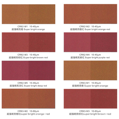 中国红系列珠光颜料是以黄红、鲜红色调为主的合成云母基材珠光效应材料。产品色泽颠覆常规珠光颜料色泽效果,具有色彩饱和度高,三维立体金属色泽强,较高的纯净度、亮度和盖率,使产品更加绚丽闪亮。